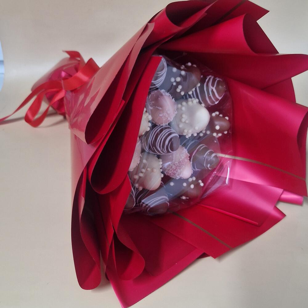 Букет из клубники в шоколаде порадует любую женщину. Мы используем только качественный бельгийский шоколад, не глазурь, поэтому вы точно насладитесь букетом.