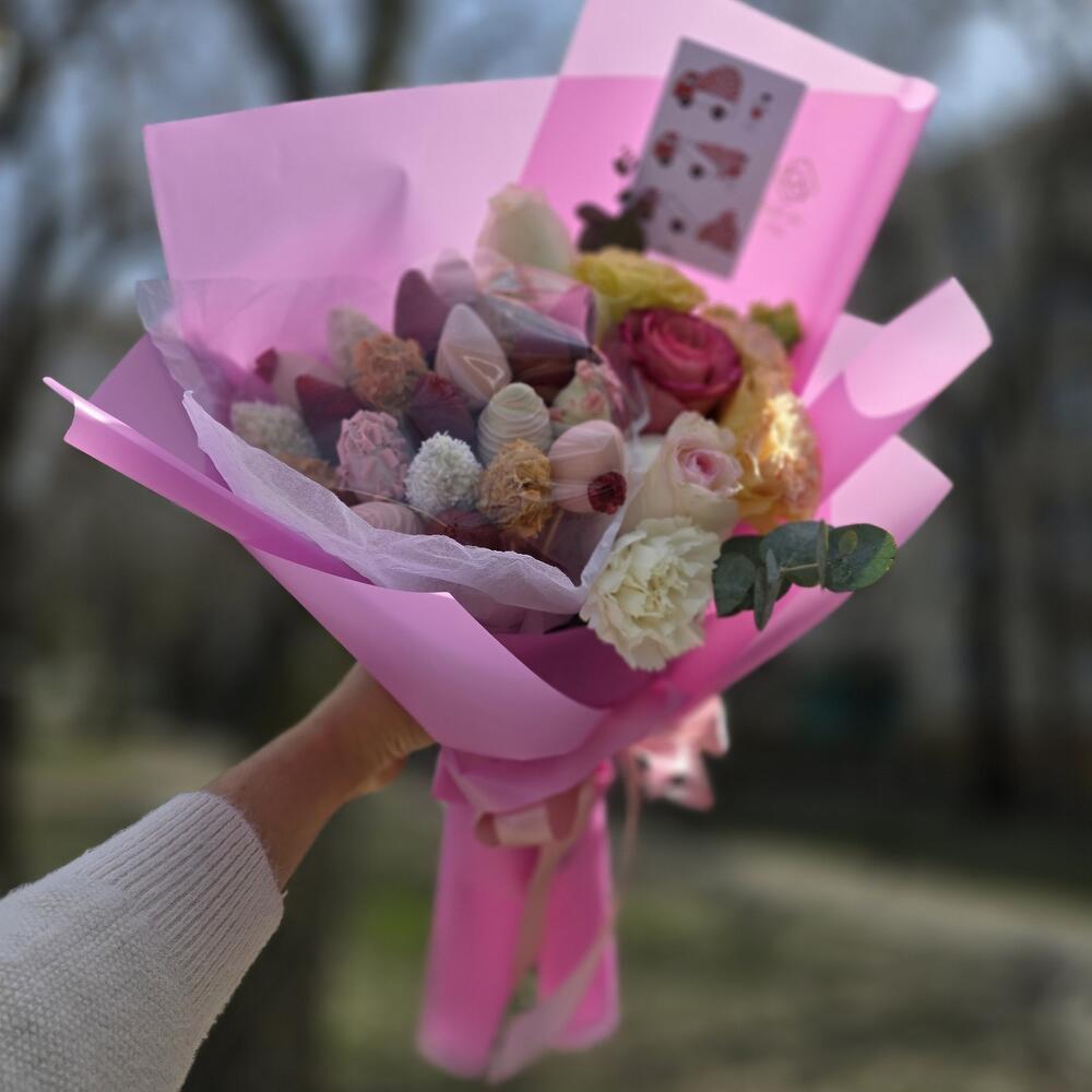 Нежный букет из клубники и цветов Мы используем только свежую клубнику и натуральный шоколад