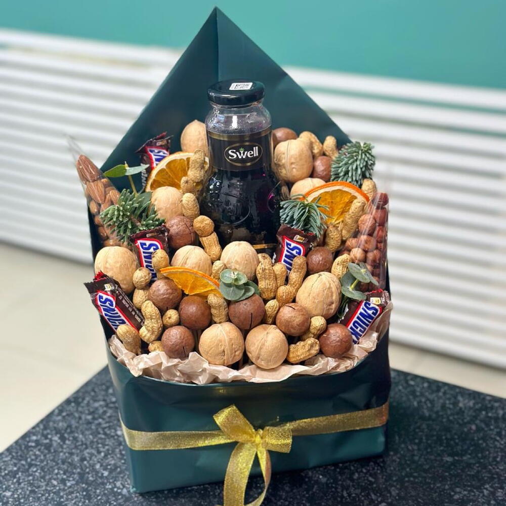 Сок в стекле - 1 шт. Орехи грецкие - 150 гр. арахис в скорлупе - 50 гр. макадамия в скорлупе - 120 гр. сушенный апельсин - 3 шт.