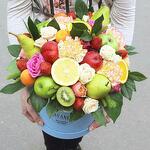 Клубника - 10 шт. Роза кустовая - 3 шт. Гвоздика - 5 шт. Коробка шляпная - 1 шт. Киви - 3 шт. Яблоко - 3 шт. Апельсин - 3 шт. Груша - 3 шт. Нектарин - 3 шт. Абрикос - 5 шт. зелень декоративная - 3 шт.