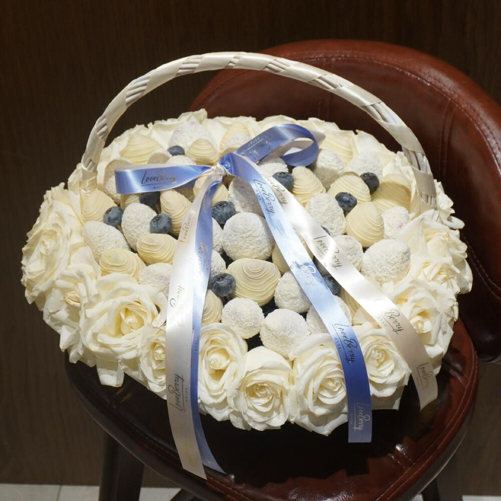 Клубника - 50 шт. Корзина плетеная - 1 шт. белые розы - 23 шт.