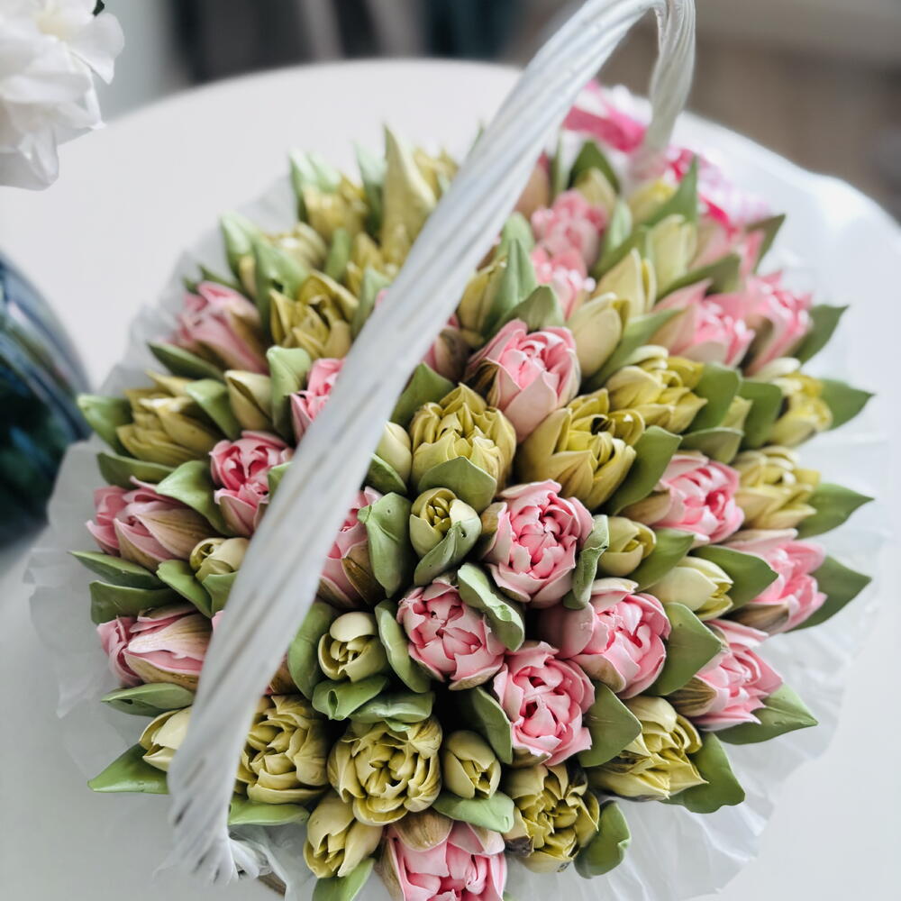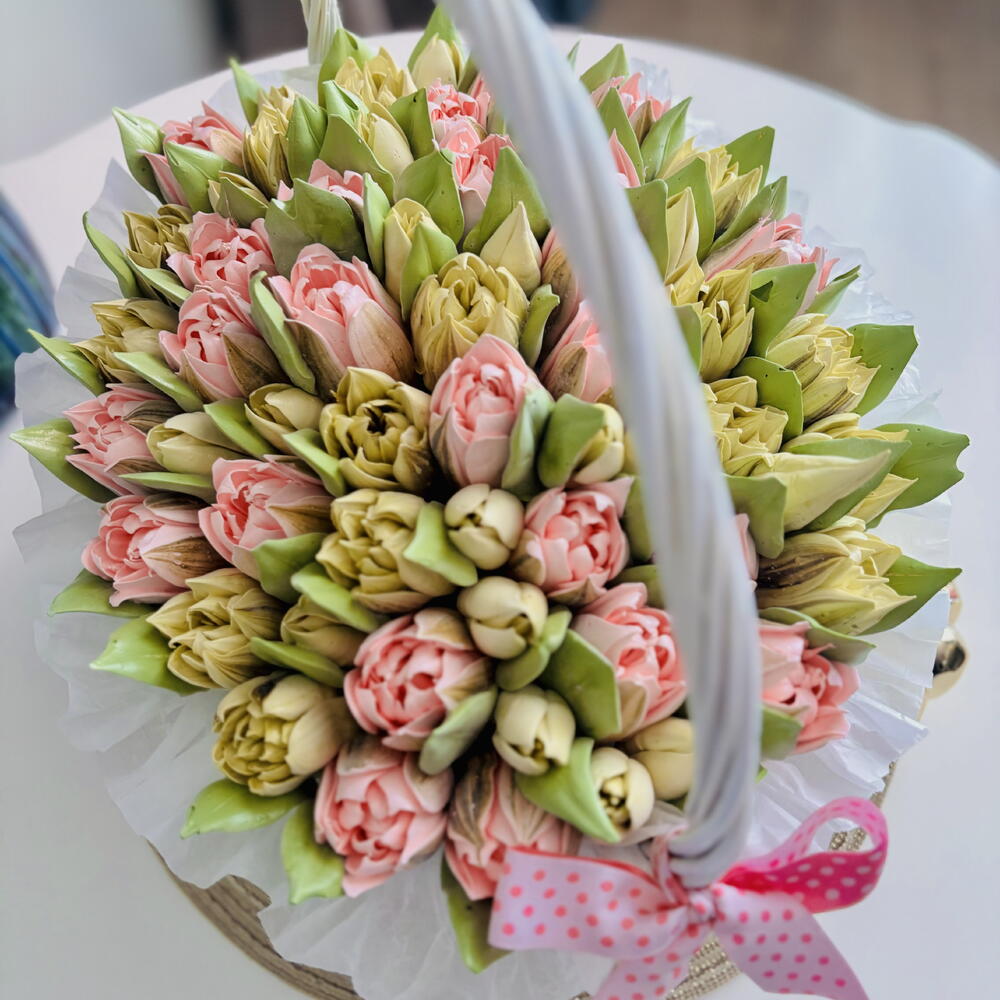 Корзина весенних тюльпанов - большая охапка восторга! Зефирные тюльпаны могут выполнены также в белом, желтом, фиолетовом цвете по желанию заказчика.