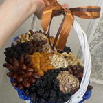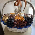 Корзина плетеная - 1 шт. Кешью - 200 гр. Курага - 200 гр. Чернослив - 200 гр. Финики - 200 гр. миндаль соленый - 200 гр. инжир сухофрукт - 200 гр. грецкий орех очищенный - 200 гр.