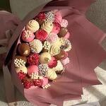 Восхитительный букет из сладостей будет прекрасным подарком для любителей ягод и шоколада! Это 24 заманчивые ягоды клубники, облаченные в три вида шоколада. Восемь ягод в белоснежной робе белого шоколада, украшенные кокосовой стружкой и посыпкой из того же шоколада. Еще восемь - в облачении из молочного шоколада, с декором из белого шоколада и сушеной малины. Завершают композицию восемь ягод в нежном покрове розового шоколада, аппетитно посыпанных кокосом. Этот шедевр кондитерского искусства поднимет настроение и подарит наслаждение от каждого укуса!