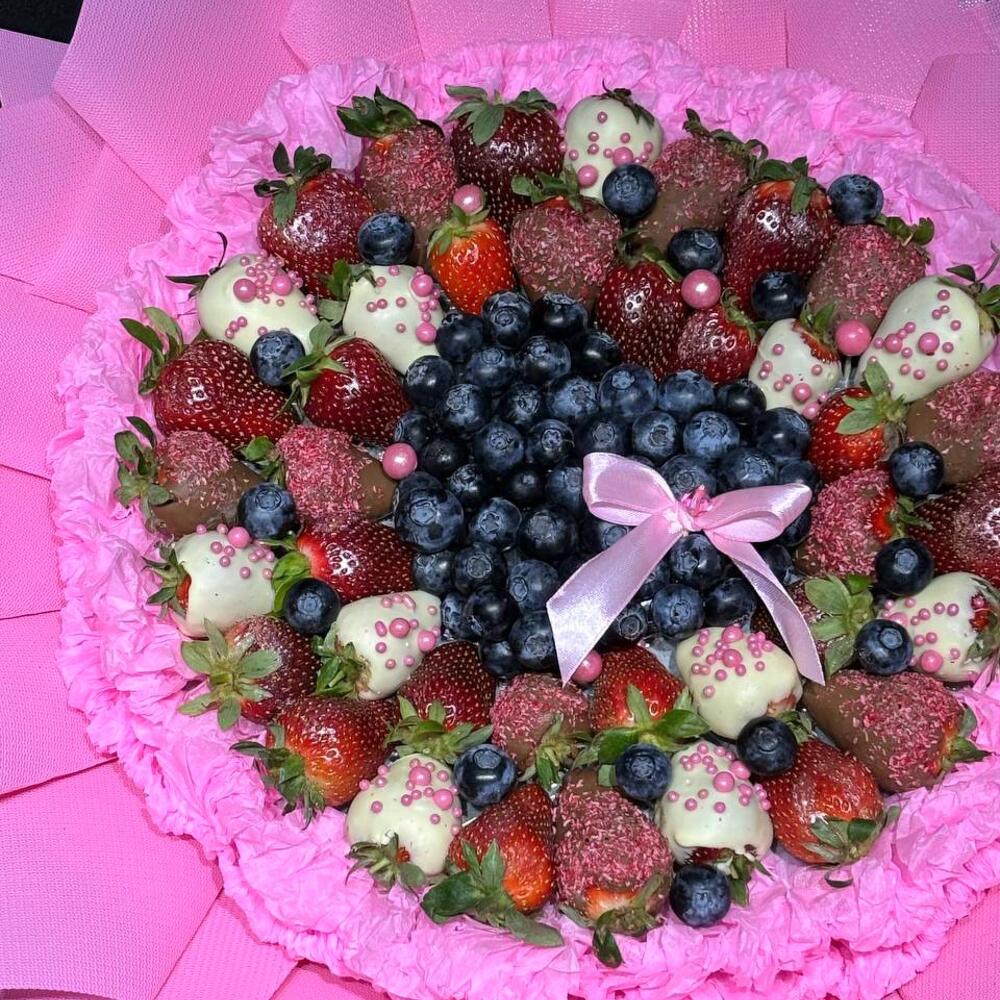 Клубника - 25 шт. Открыточка с вашими пожеланиями - 1 шт. Клубника в шоколаде - 22 шт. голубика 125 гр. - 2 шт.
