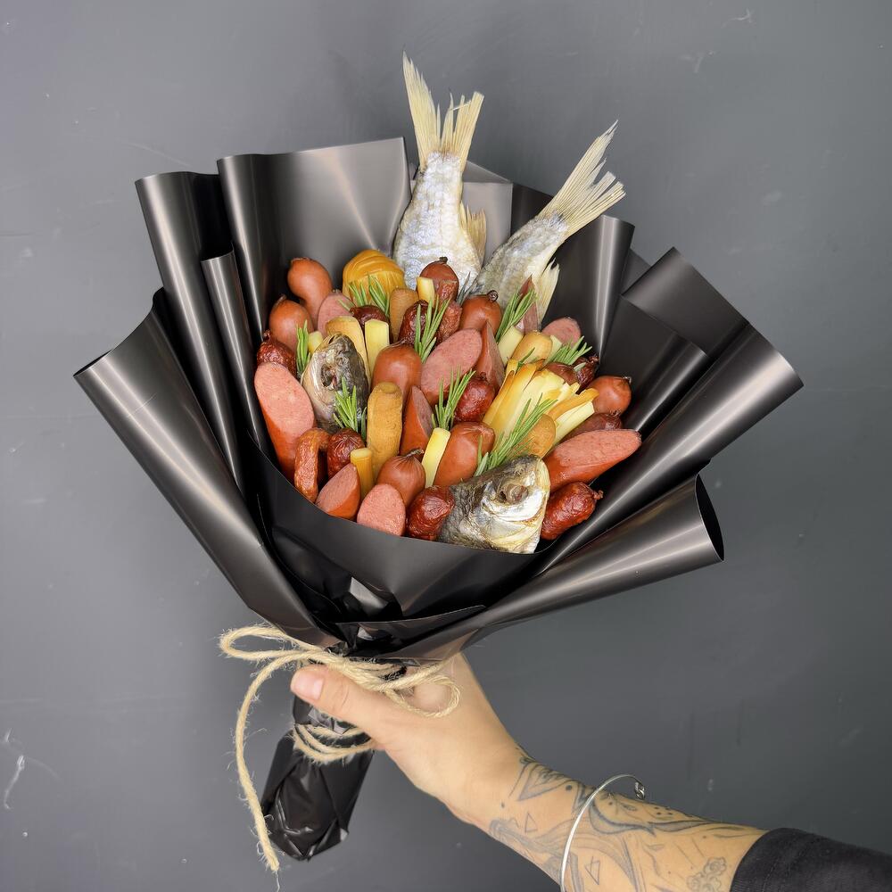 Вобла сушеная - 2 шт. Охотничьи колбаски - 15 шт. хлебные палочки - 10 шт. чечил косичка - 1 шт. кабаноси - 15 шт. патроны колбаски упаковка - 1 шт.