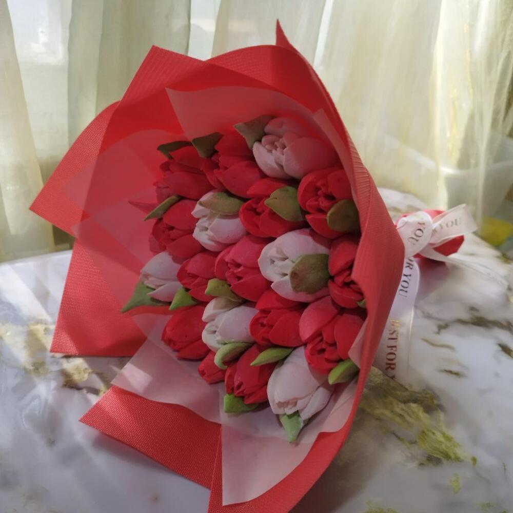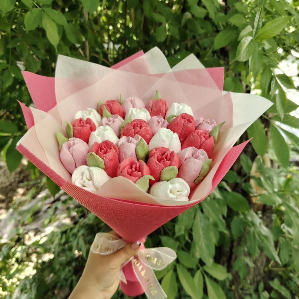 Мини букет из зефирных тюльпанов, со вкусом клубники и яблоко-ваниль.