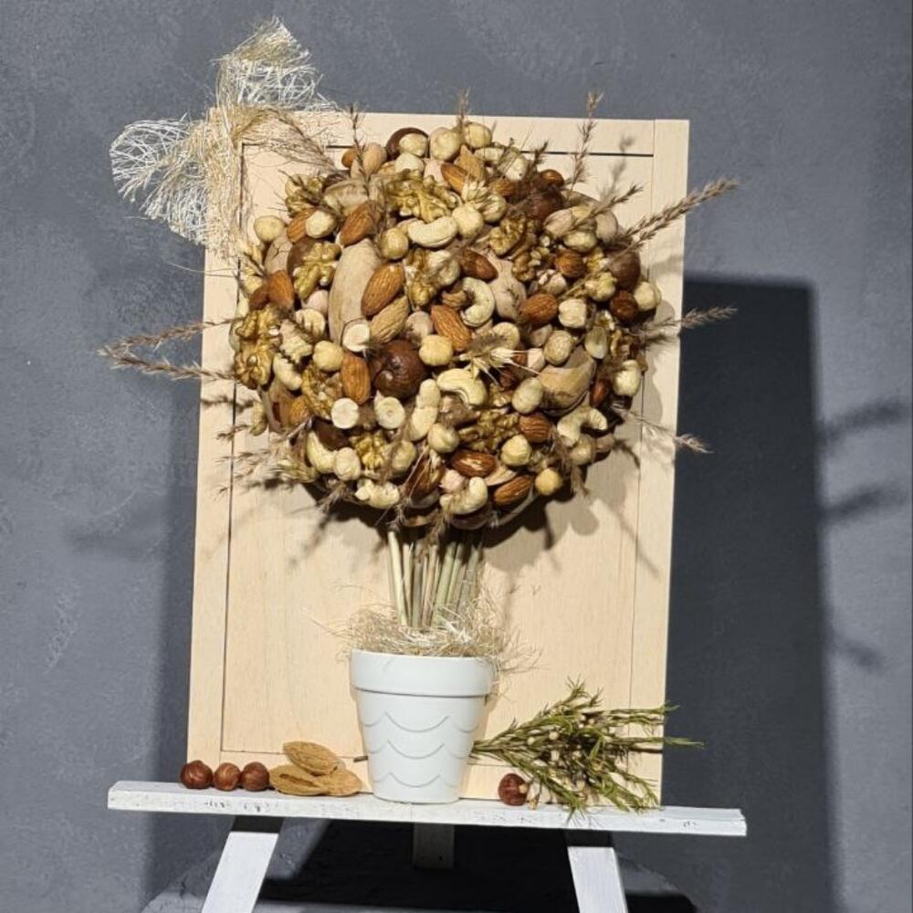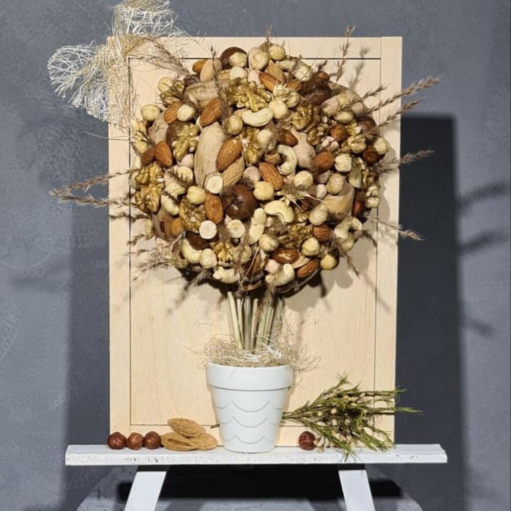 Мольберт изготовлен из качественного материала (фанеры). Украшенный орехами в виде букета! Отличный подарок для творческих людей!