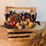 Грецкий орех - 5 шт. Кириешки - 3 шт. Фисташка пучок - 1 шт. Фисташки соленые - 2 шт. Сосиски копченые - 200 гр. макадамия - 10 шт. соленый арахис - 3 шт. чечил косичка - 2 шт. арахис в оболочке - 2 шт. мясные снеки (упаковка) - 1 шт. лимонад буратино - 1 шт.