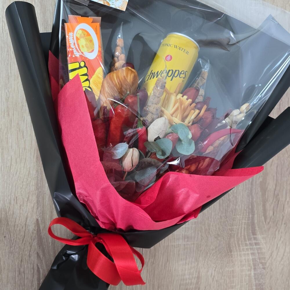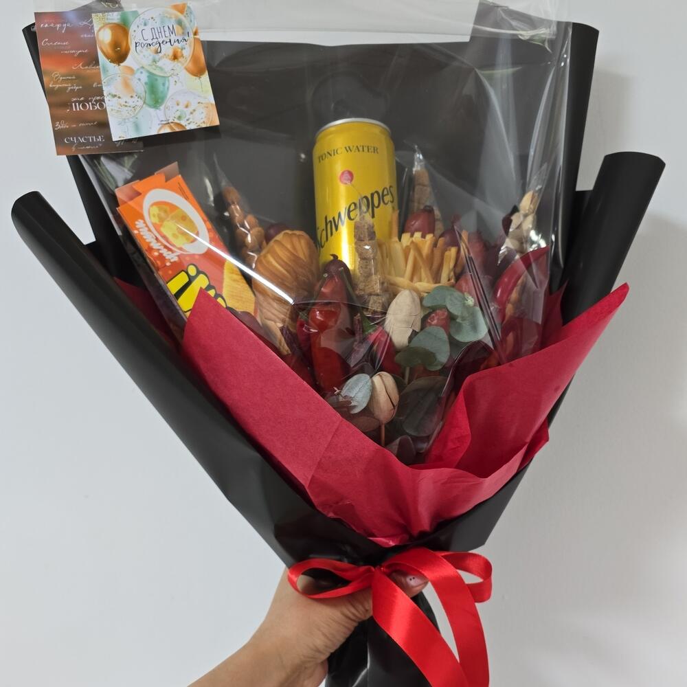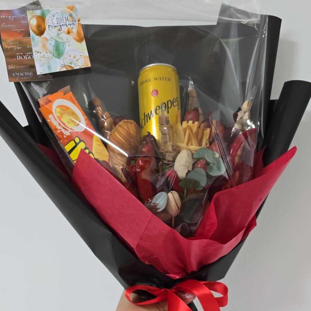 Кириешки - 2 шт. Арахис - 1 шт. Фисташки - 1 шт. Сосиски копченые - 100 гр. швепс - 1 шт. чечил косичка - 200 гр. арахис в оболочке - 2 шт. мясные палочки - 50 гр.
