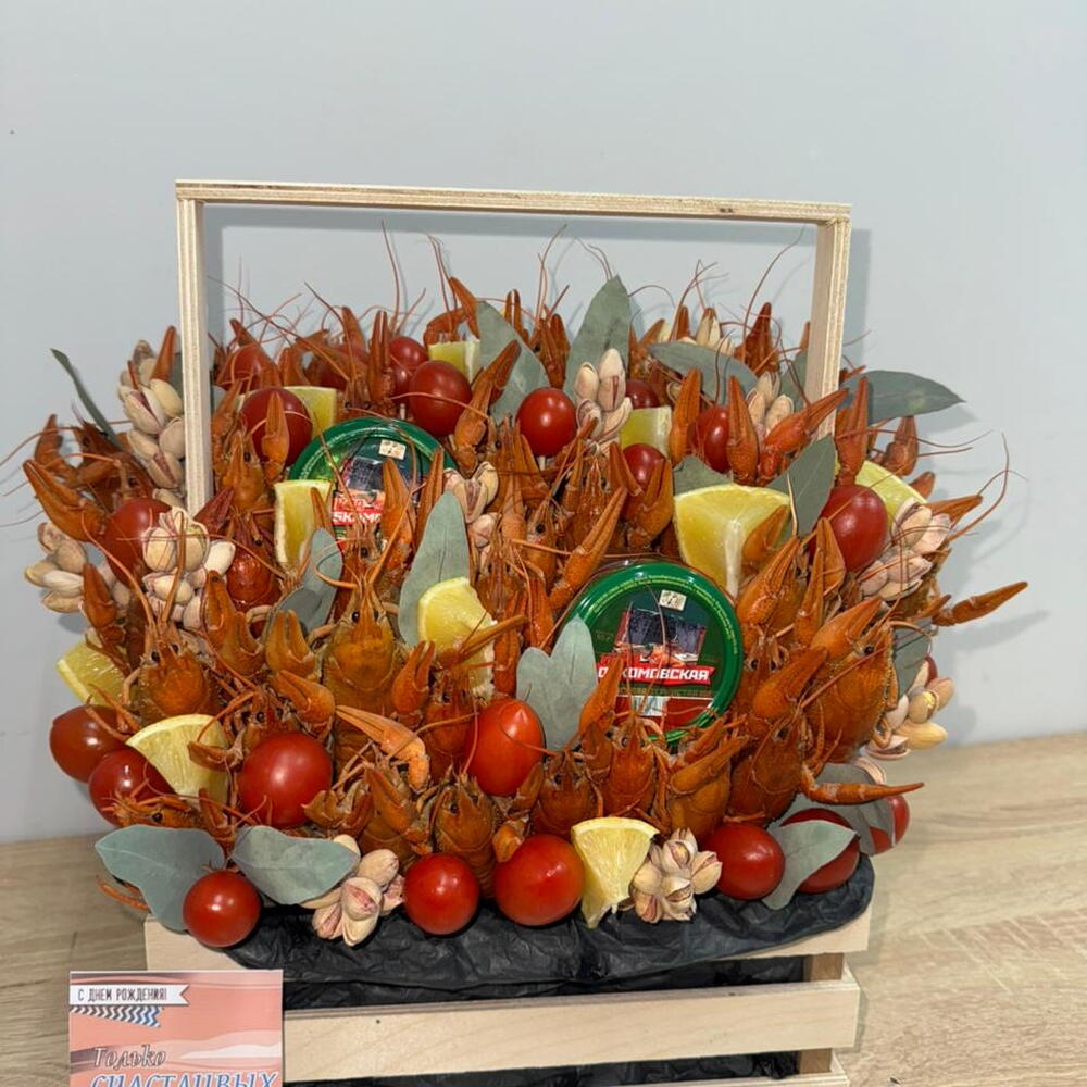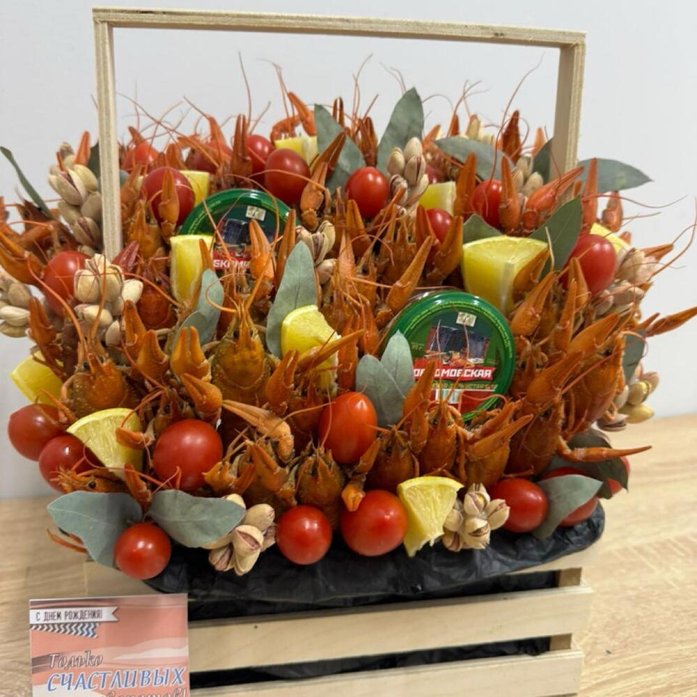 Лимон - 2 шт. Ящик деревянный - 1 шт. Пленка прозрачная - 1 шт. Фисташки соленые - 10 шт. помидоры черри - 300 гр. эвкалипт декоративный - 5 шт. раки вареные - 50 шт. открытка с вашими пожеланиями - 1 шт. икра лососевая в стеклянной банке - 2 шт.
