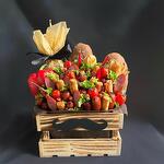 Багет - 1 шт. Копченые колбаски - 20 шт. Колбаски охотничьи - 10 шт. хлебные палочки - 10 шт. черри помидоры - 7 шт. чечил косичка - 1 шт. кабаноси - 10 шт. перец светофор - 1 шт.