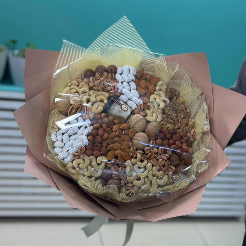 Грецкий орех - 50 гр. Кешью - 100 гр. Миндаль - 100 гр. Мед суфле - 1 шт. Фундук - 100 гр. Фисташки - 20 шт. арахис в глазури - 50 шт.