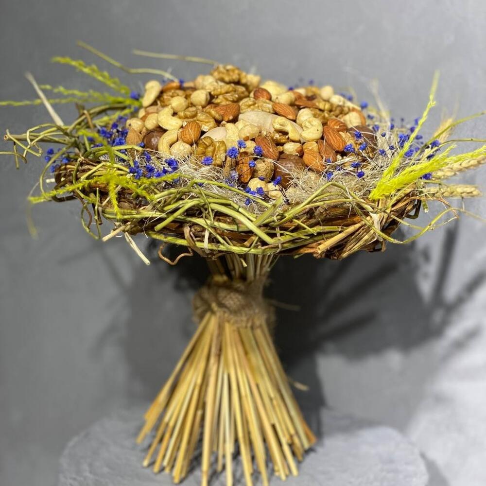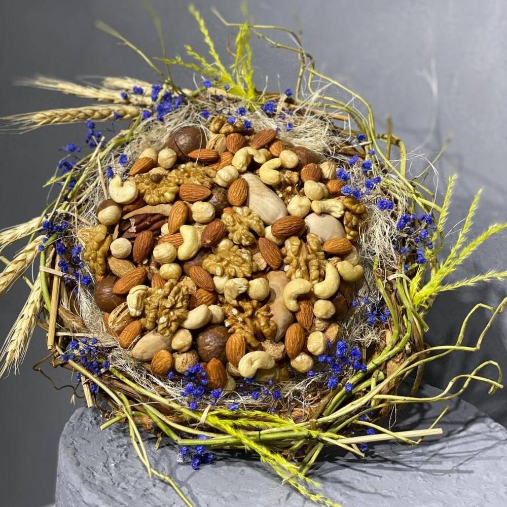 Кешью - 58 гр. Фундук - 27 гр. пекан - 37 гр. макадамия - 20 гр. миндаль чищеный - 73 гр. грецкий чищенный - 105 гр. бадам - 34 гр.