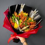 Мужской букет из свежих варенных раков и корченной рыбы.