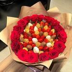 Клубника - 45 шт. Шоколад - 23 шт. крафтовая бумага - 10 шт. розы - 17 шт. бисквитные крошки - 15 шт.