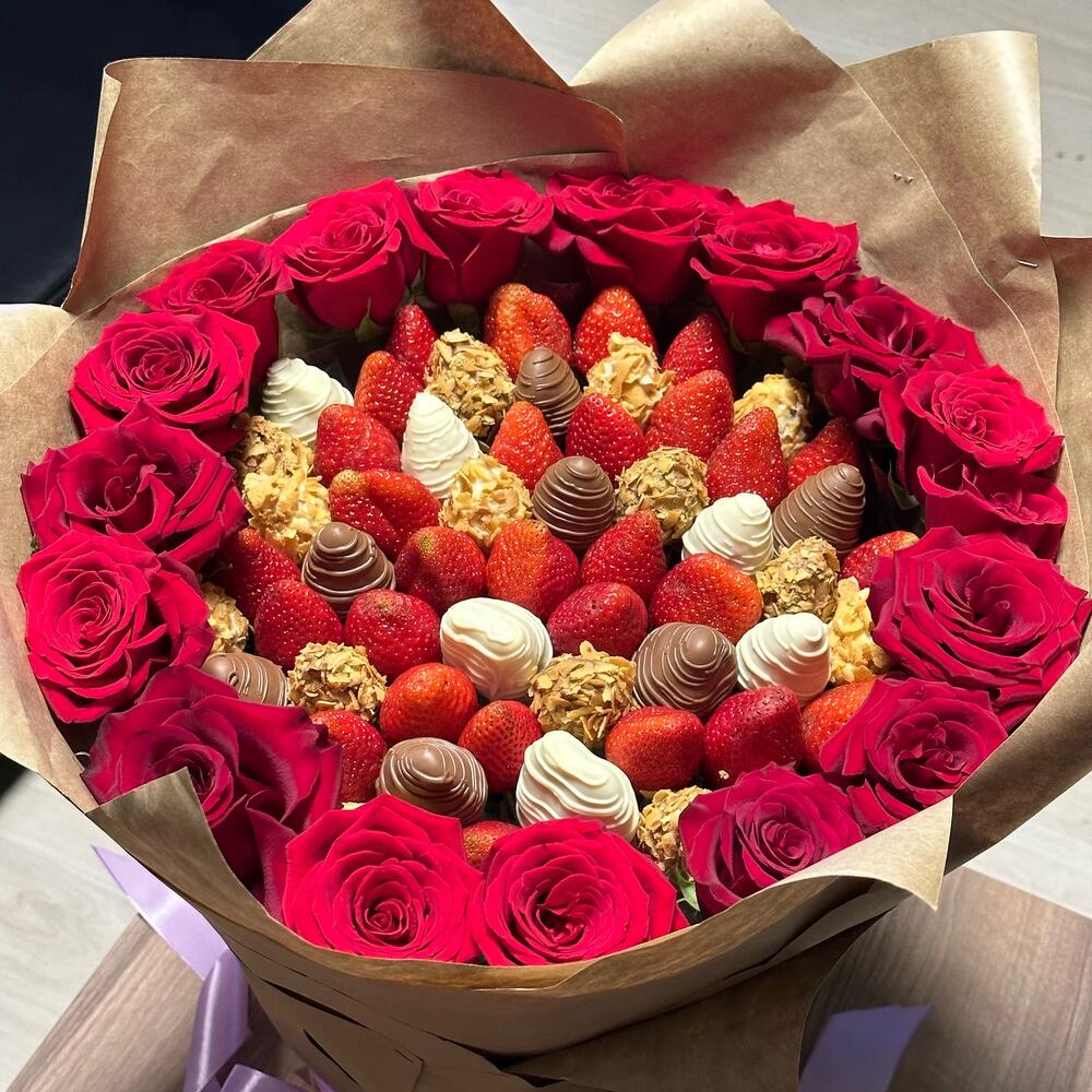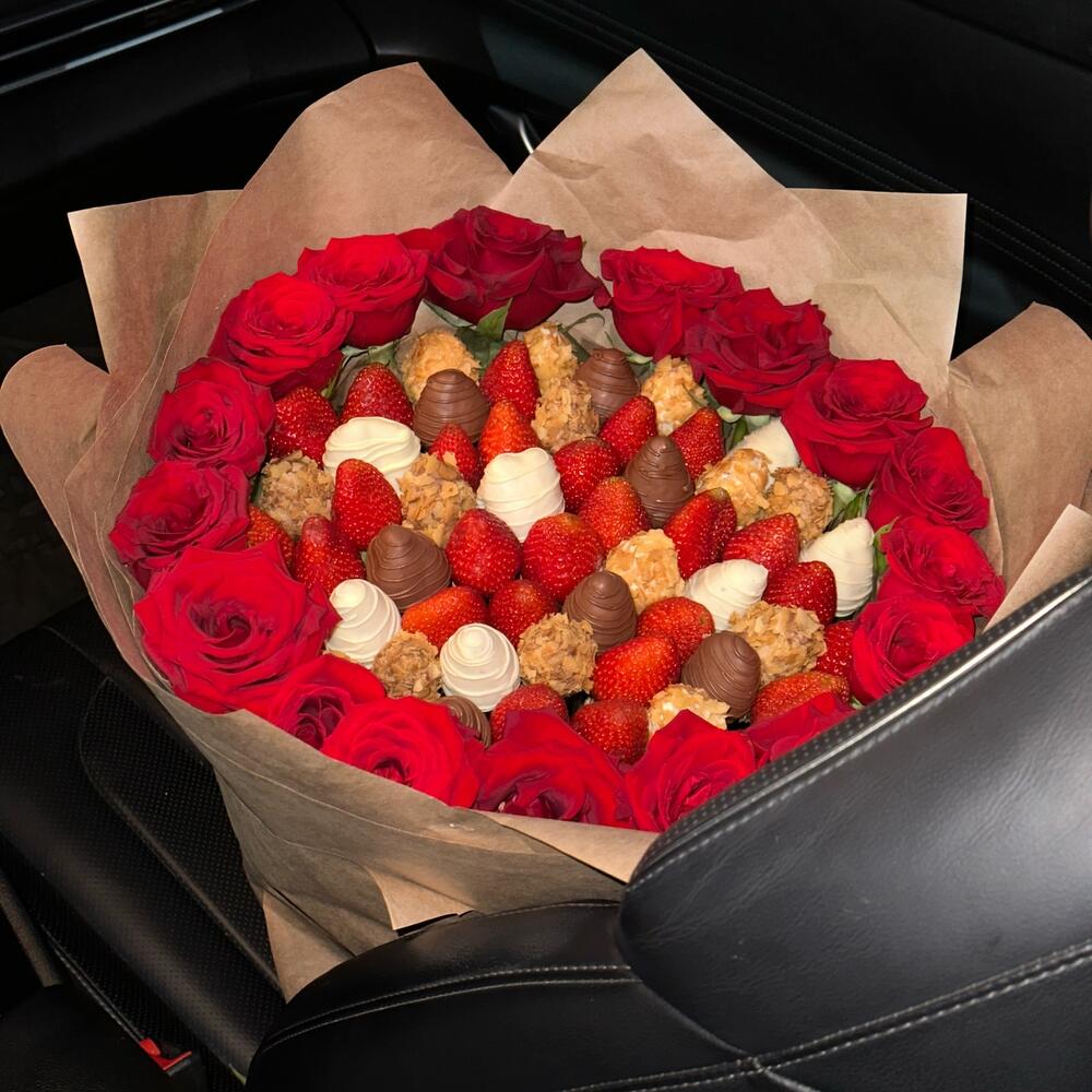 Клубника - 45 шт. Шоколад - 23 шт. крафтовая бумага - 10 шт. розы - 17 шт. бисквитные крошки - 15 шт.