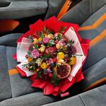 Яркий витаминный букет — сочный микс граната, грейпфрута, клубники и мандаринов, украшенный нежными розами и зеленью. Настроение — вкус жизни! 🍊✨