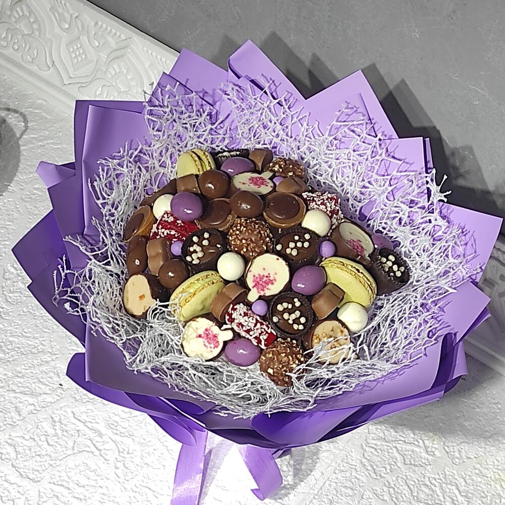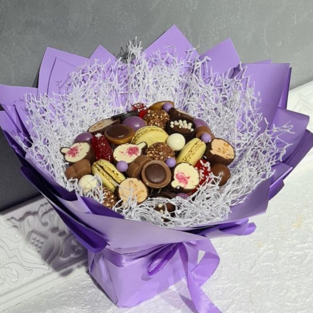 Мармелад - 3 шт. Печенье макарон - 3 шт. Ferrero rocher - 3 шт. воздушный рис - 5 шт. тоффифи конфеты - 3 шт. конфеты ассорти - 10 шт. конфеты милка - 4 шт. драже шоколадные - 10 шт.