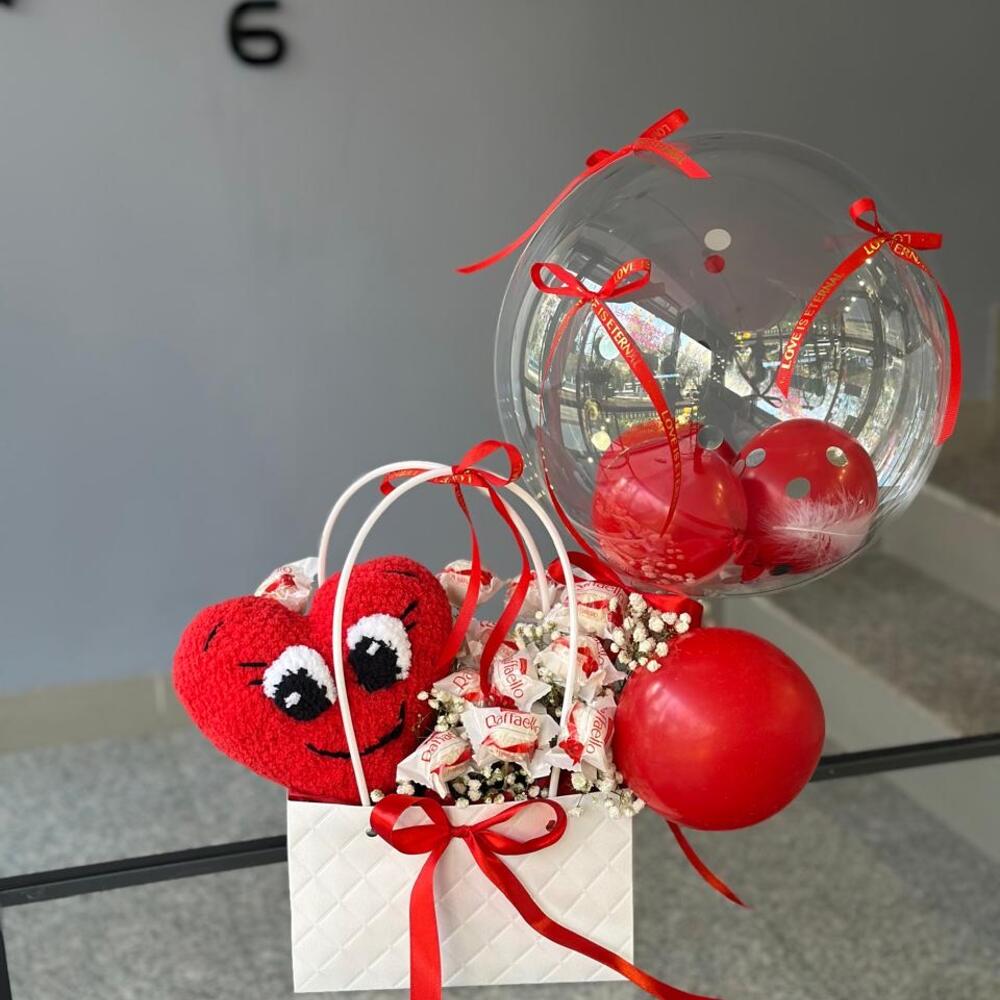 Гипсофила - 2 шт. Раффаэлло - 15 шт. Шар - 3 шт. шар баблс - 1 шт. игрушка вязаная ручной работы - 1 шт.