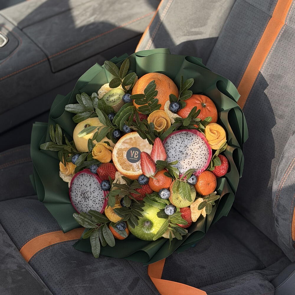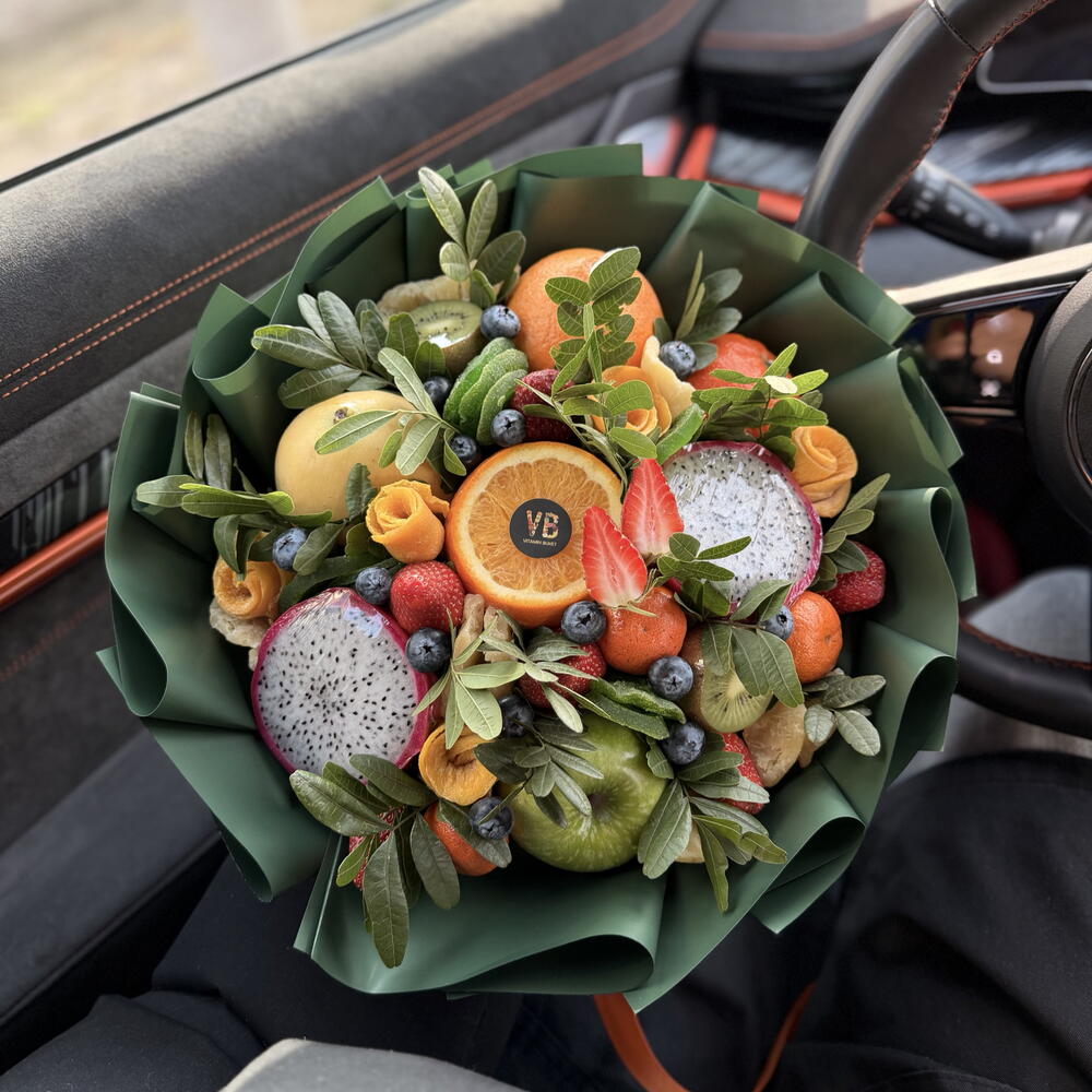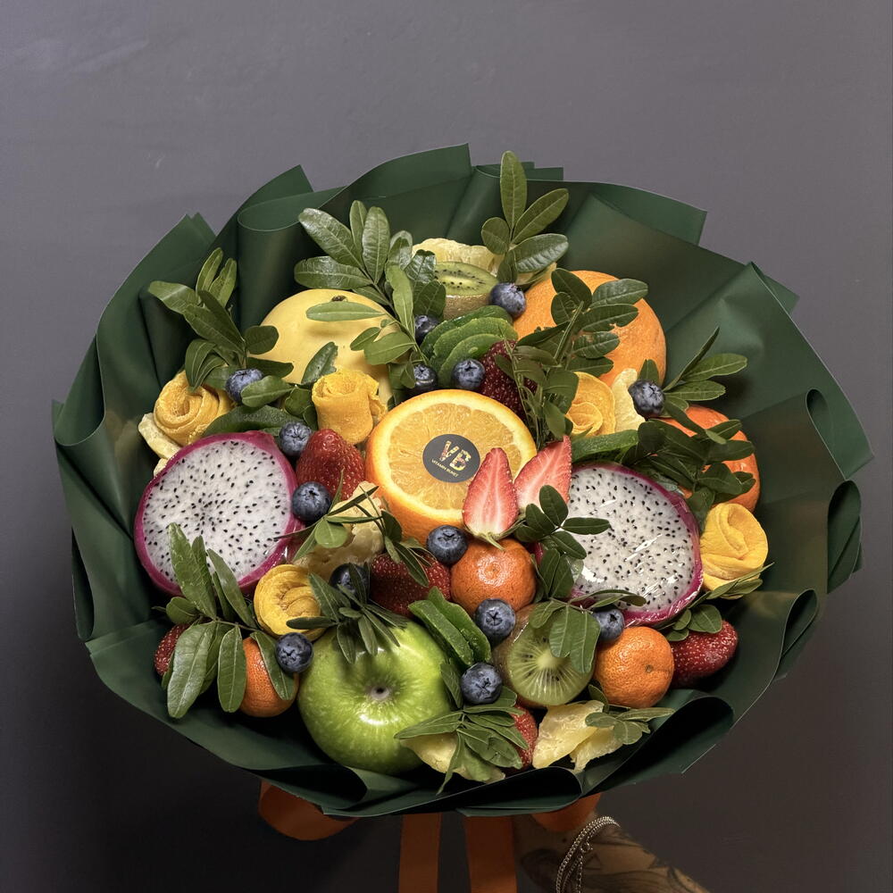 Клубника - 8 шт. Киви - 3 шт. Апельсин - 2 шт. Мандарин - 3 шт. Голубика - 75 гр. манго - 1 шт. Питахайя - 1 шт. Ананас сушеный - 6 шт. Манго сушеный - 5 шт. киви сушеный - 8 шт. Яблоки - 1 шт.