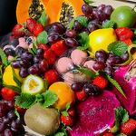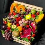 Клубника - 200 гр. Киви - 1 шт. Персик - 2 шт. Слива - 2 шт. Ящик деревянный - 1 шт. манго - 1 шт. Открыточка с вашими пожеланиями - 1 шт. Маракуйя - 2 шт. Папайя - 1 шт. Абрикос - 2 шт. Питахайя - 1 шт. Виноград гроздь - 1 шт. Клубника в шоколаде callebaut (бельгия) - 9 шт. зелень декоративная - 1 шт. голубика в шоколаде - 100 гр.