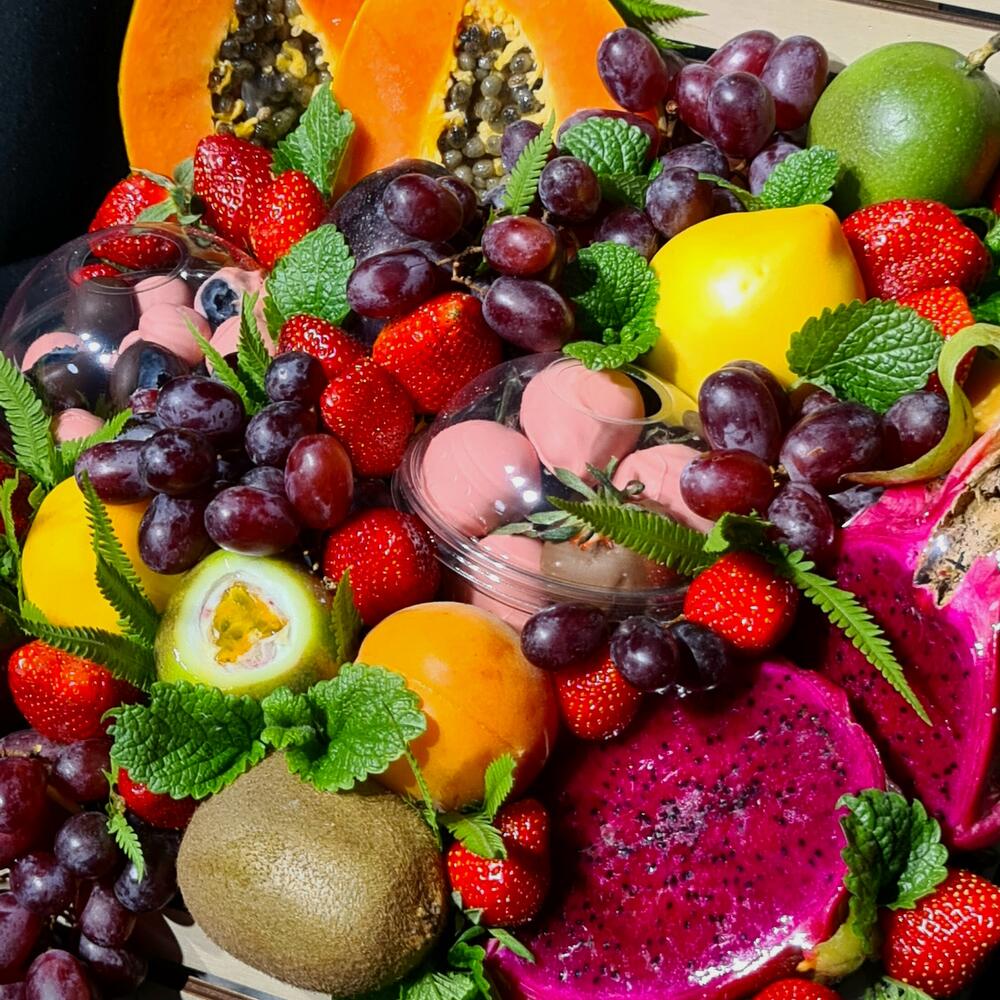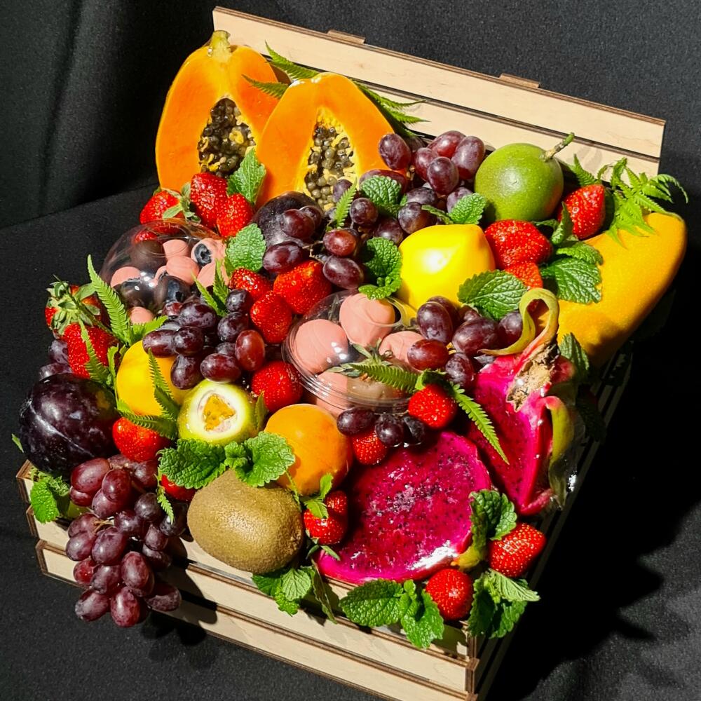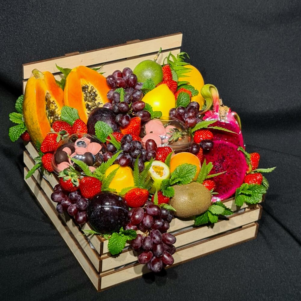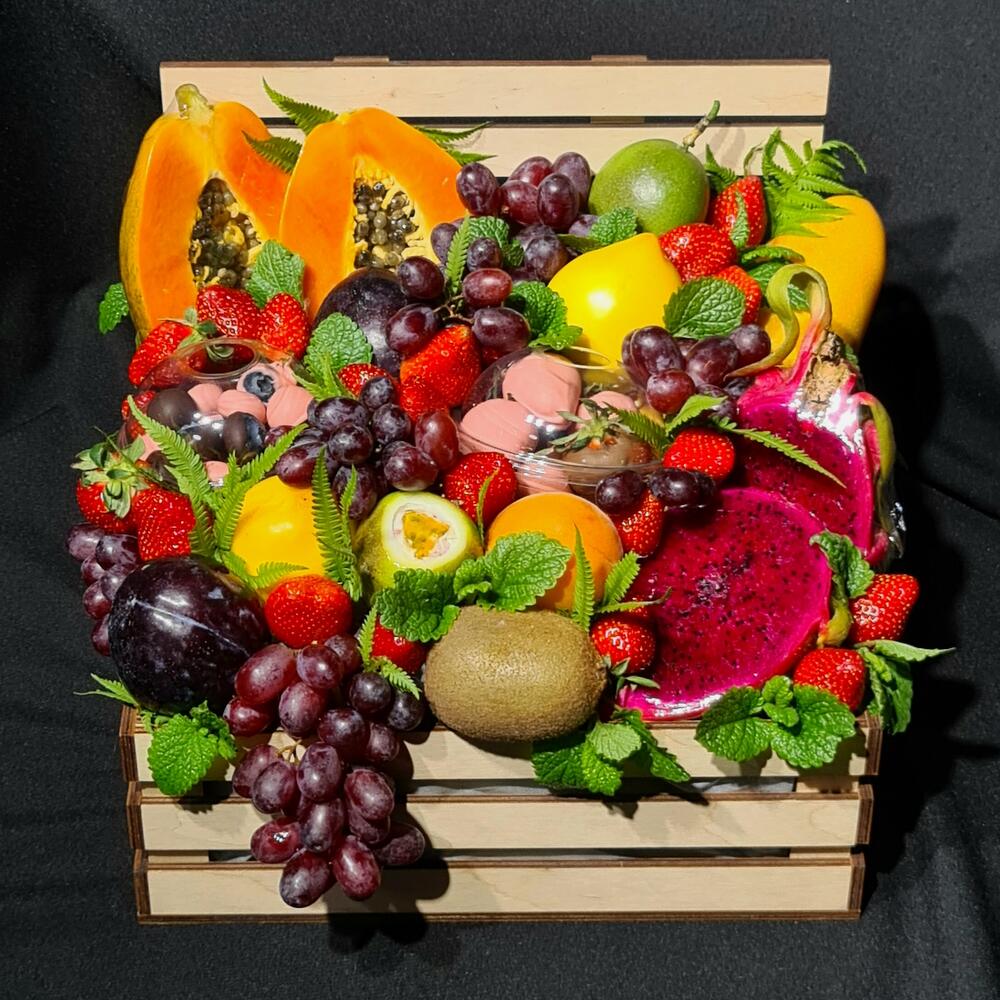Клубника - 200 гр. Киви - 1 шт. Персик - 2 шт. Слива - 2 шт. Ящик деревянный - 1 шт. манго - 1 шт. Открыточка с вашими пожеланиями - 1 шт. Маракуйя - 2 шт. Папайя - 1 шт. Абрикос - 2 шт. Питахайя - 1 шт. Виноград гроздь - 1 шт. Клубника в шоколаде callebaut (бельгия) - 9 шт. зелень декоративная - 1 шт. голубика в шоколаде - 100 гр.
