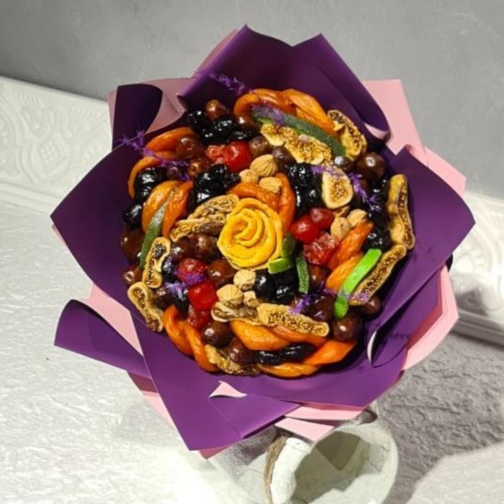 Букет собран из сухофруктов. Яркий, красочный. Прекрасный подарок для любимых и близких!
