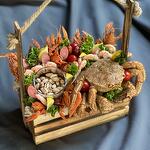Лимон - 200 гр. Лист салата - 100 гр. Фисташки соленые - 200 гр. черри помидоры - 5 шт. раки вареные - 250 гр. краб волосатик - 1 шт. кабаноси - 200 гр. креветки вареные - 150 гр. патроны - 6 шт.