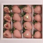 16 клубник в бельгийском розовом шоколаде; В дополнении используются посыпки: кандурин, сублимированный инжир