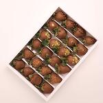 24 клубник в бельгийском молочном шоколаде; В дополнении используются посыпки: вафельная крошка, фисташка, кандурин и вафельные шарики; Шоколад ручной работы