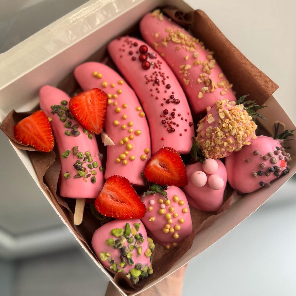 Свежая клубника и бананы в белом бельгийском шоколаде, ореховая посыпка