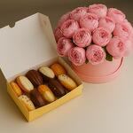 Букет из пионовидных роз в сочетании с боксом нежных мадленов — элегантный и утончённый подарок. Роскошные цветы подчеркнут особый момент, а изысканное печенье добавит сладости и уюта празднику.