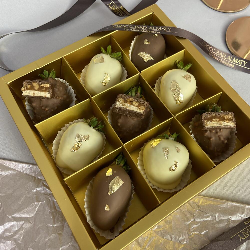 Премиальный набор от CHOCO BAR ALMATY ✨ Изысканное сочетание вкусов: — свежая клубника в белом бельгийском шоколаде Callebaut, украшенная сусальным золотом; — клубника в молочном шоколаде Callebaut с добавлением арахиса и кусочков “Сникерса”, для тех, кто любит насыщенные текстуры и карамельный вкус. Каждая ягода создана вручную с вниманием к деталям, чтобы дарить эстетическое удовольствие и настоящее наслаждение вкусо