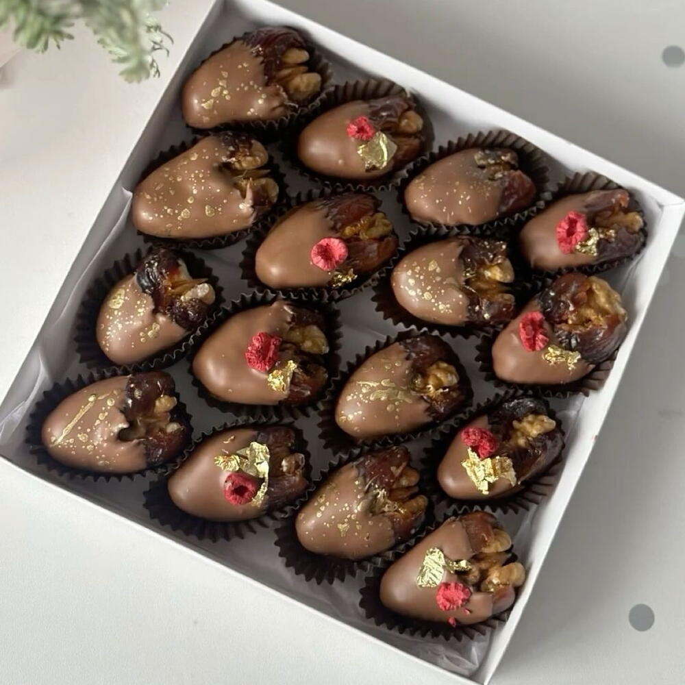 Royal dates 16 pcs, Assorted nuts (cashews 10 g, walnuts 30 g, almonds 15 g, hazelnuts 10 g) Belgian milk chocolate 130 g Decor freeze-dried raspberry 10 g, gold 5 g