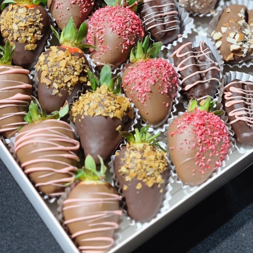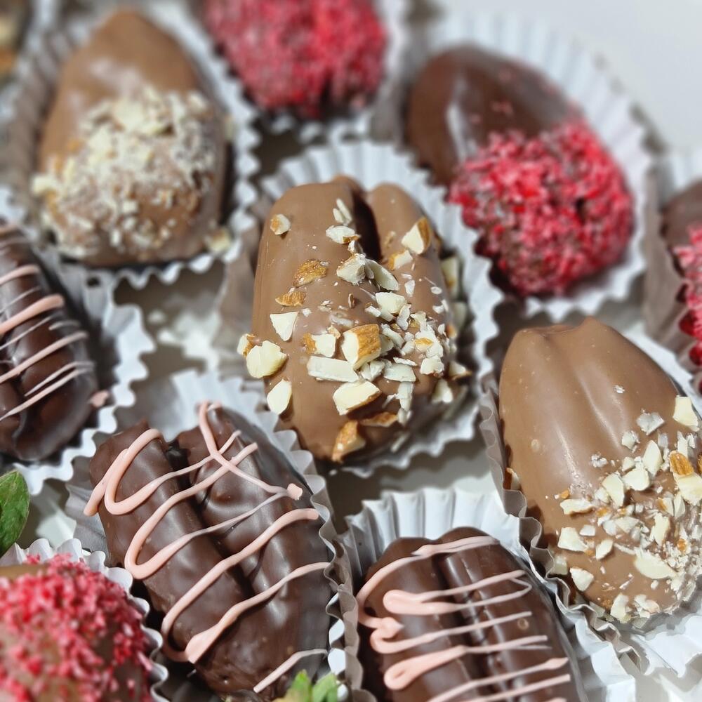 Клубника в молочном бельгийском шоколаде Callebaut,украшенная кокосовой стружкой,.Клубника в тёмном бельгийском шоколаде Callebaut,украшенная вафельной крошкой .клубника в молочном бельгийском шоколаде Callebaut. Королевские финики в молочном бельгийском шоколаде Callebaut с грецким орехом внутри, украшенные дробленым грецким орехом. Королевские финики в тёмном бельгийском шоколаде Callebaut с грецким орехом внутри, украшенные кокосовой стружкой . Королевские финики в молочном бельгийском шоколаде Callebaut с грецким орехом внутри.