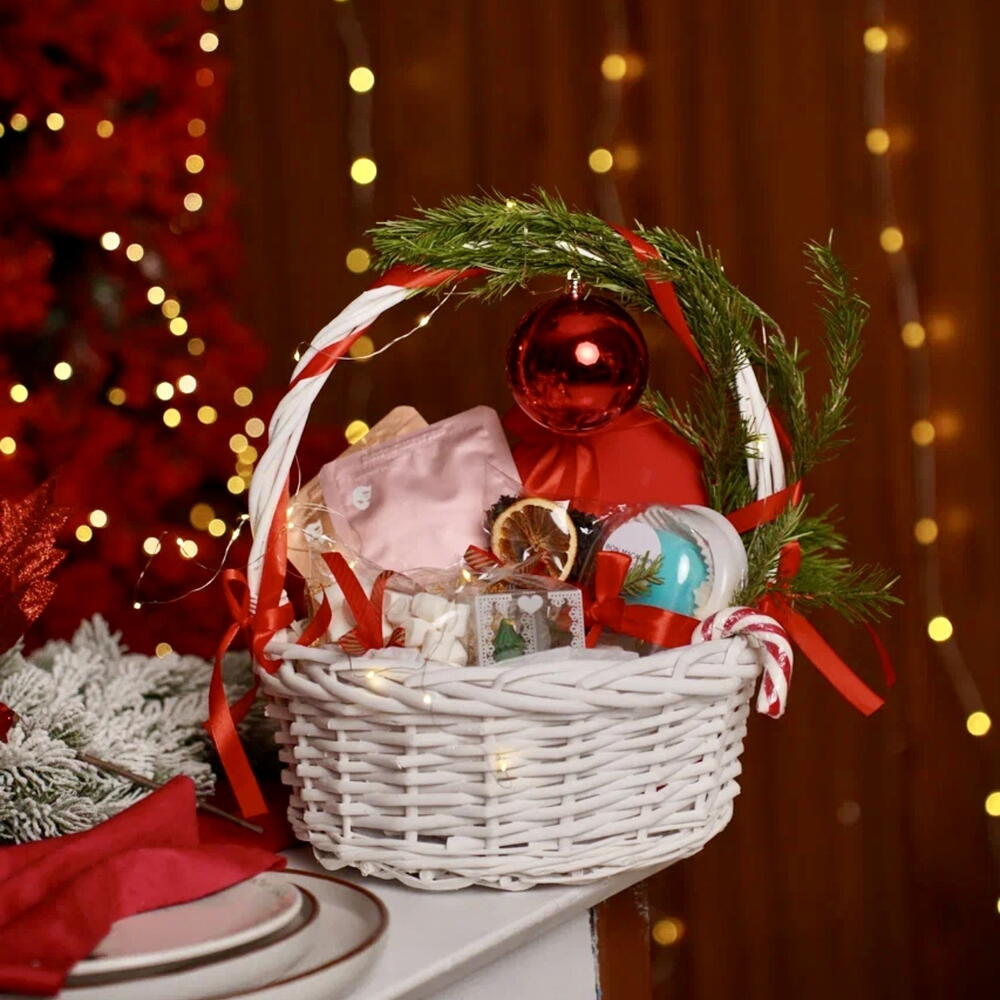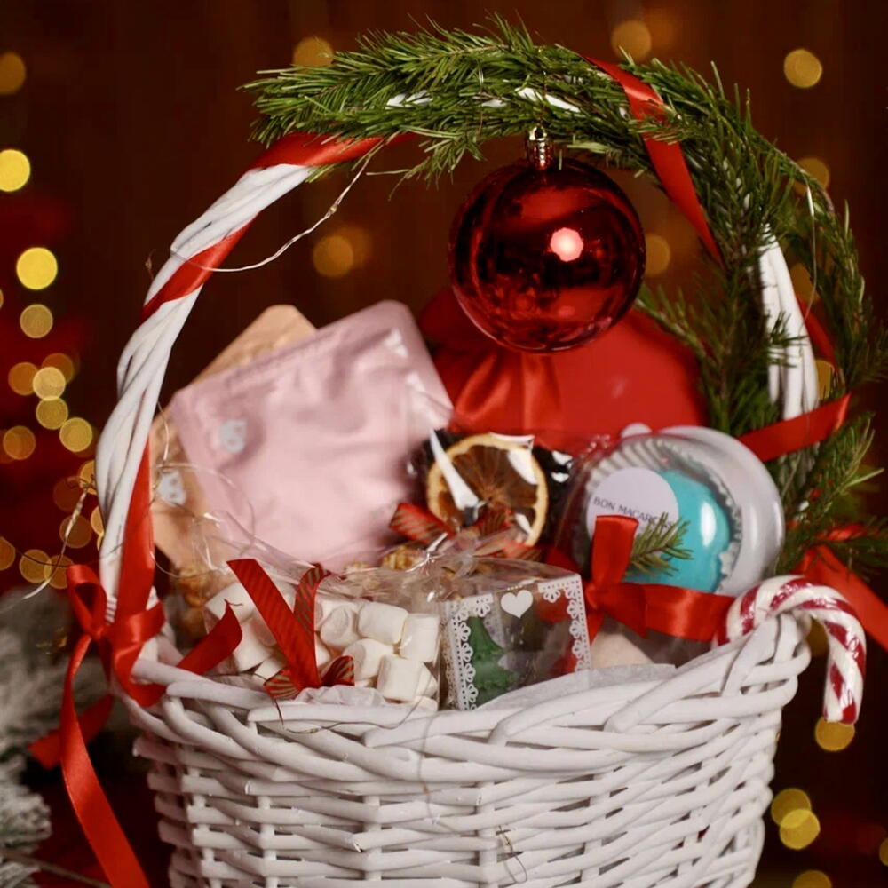Состав корзины: набор макаронс 10шт, 2шт Моти, чай, попкорн, маршмеллоу, карамельная тросточка, маски для лица 2 шт, корзина, новогодний шар, свеча в виде елки.