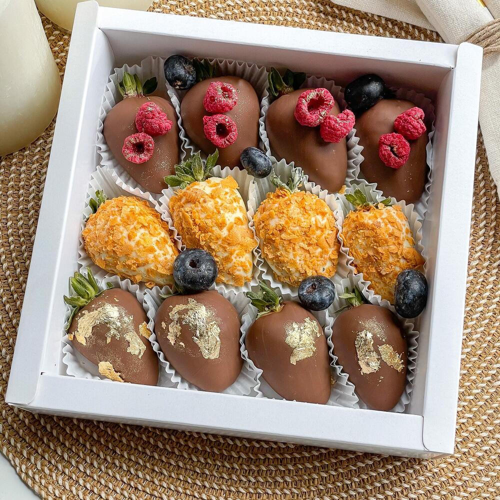 Клубничный бокс "Ягодный пирог" из клубник в молочном шоколаде с буквами на плиточных шоколадках!