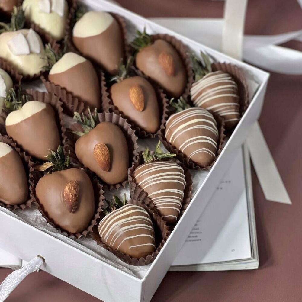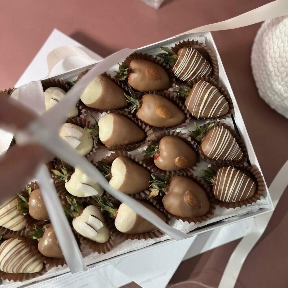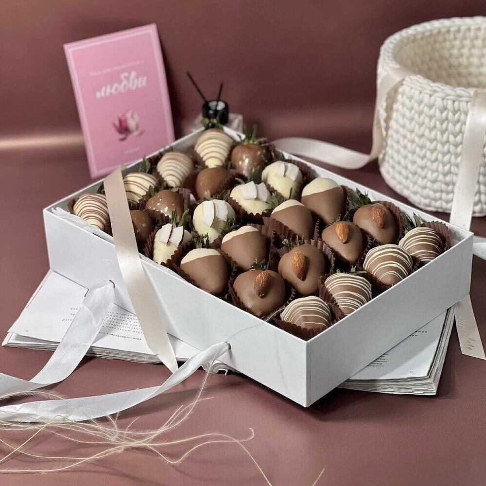 Десерт, который восхищает - свежая отборная клубника в самом лучшем бельгийском шоколаде callebaut, приготовленная профессиональными кондитерами. Клубника помещена в созданную нами уникальную коробку, которая не только помещает в себя большое количество клубники в шоколаде, но и имеет удобные ручки, с которыми транспортировка и вручение подарка станут более удобными и презентабельными! в наборе собрана вкуснейшая клубника в белом и молочном шоколаде, часть из которых посыпана крупной стружкой кокоса и цельным миндалём. Вес: 800 гр. Размер коробки стандарт - 33 см*23 см*6 см. Количество ягод в наборе: 24 или 35 ягод в зависимости от размера клубники. Рекомендуем употребить продукцию, содержащую свежие ягоды, в течение первых 12 часов после покупки и хранить при температуре от +15 до +20 с. Либо хранить в холодильнике при температуре от +4 до +10 с до 2 суток перед употреблением подержать при комнатной температуре 15 минут. При создании заказа, у вас появится окно с дополнительными товарами, среди которых вы можете добавить: - тематические шоколадные топперы - поздравительные интересные открытки - воздушные шары - вазу для вашего букета - транспортировочный брендированный пакет.