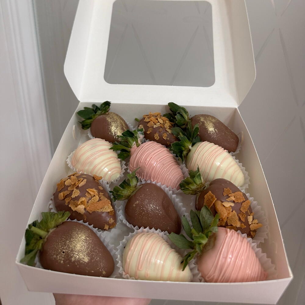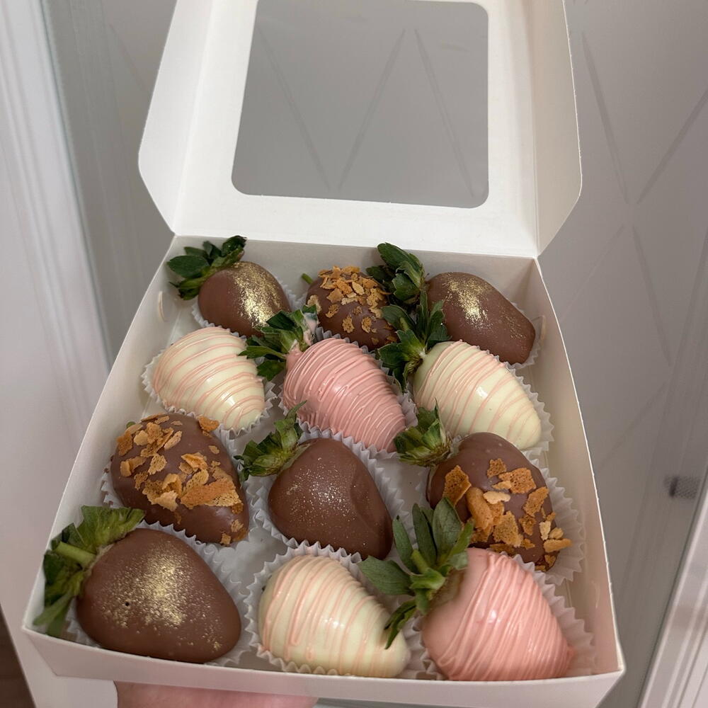 Клубника свежая , количество 12штук, шоколад Callebaut (какао-масло, какао тёртое — для тёмного; сухое молоко — для молочного и белого; сахар), эмульгатор: соевый лецитин, натуральная ваниль. Оформление: дроблёные фисташки и лёгкий перламутровый блеск кондурина.