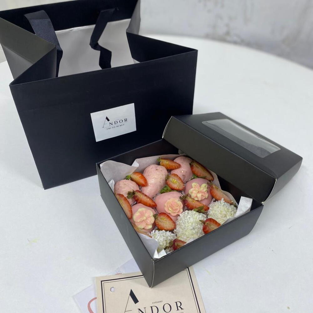 Professional strawberry presentation, branded premium presentation (bag, box), instruction. We also wash every strawberry, which attests to quality.