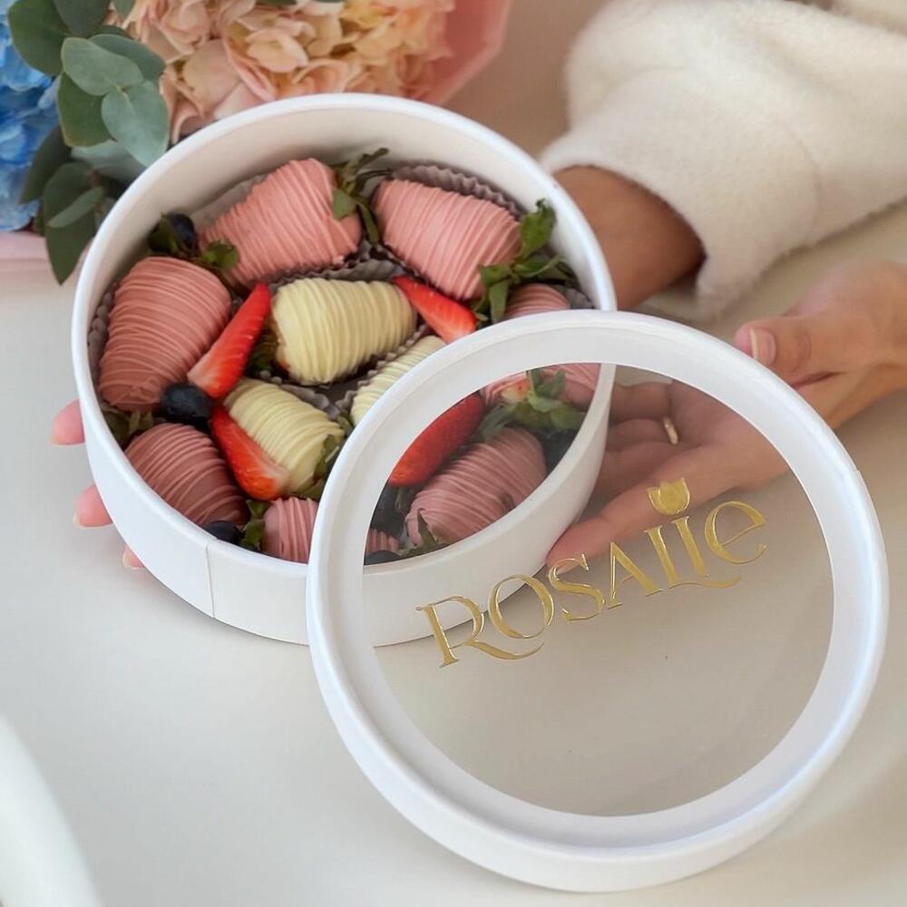 We make fresh strawberries coated in milk chocolate. We also decorate the strawberries with additional fruits. The strawberries are served in a branded box with a ribbon.