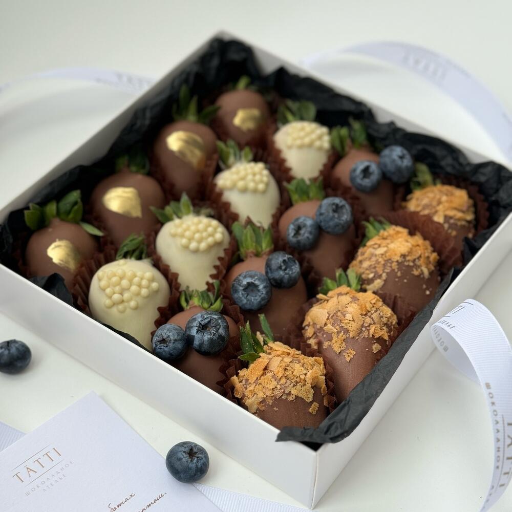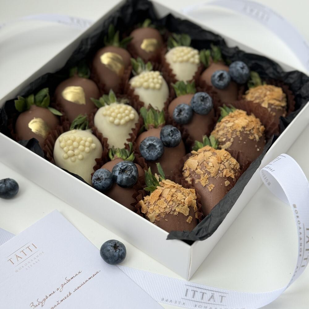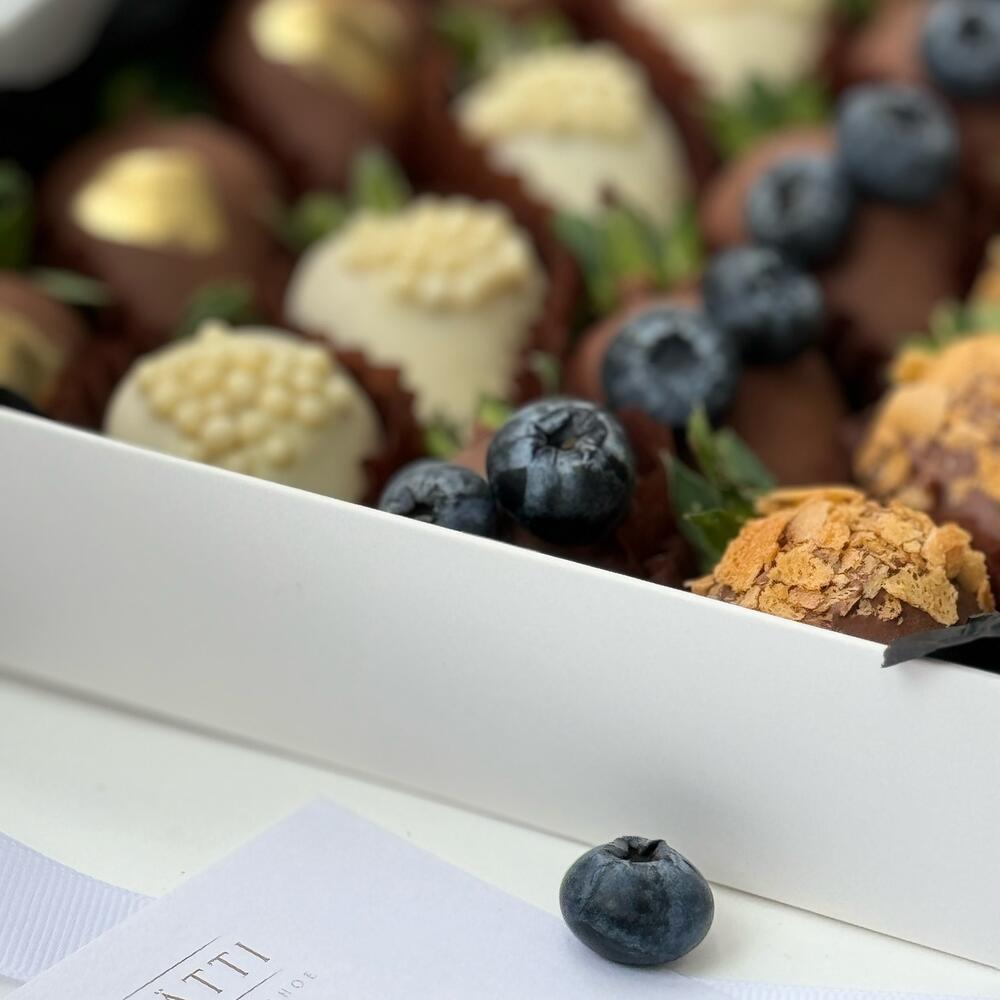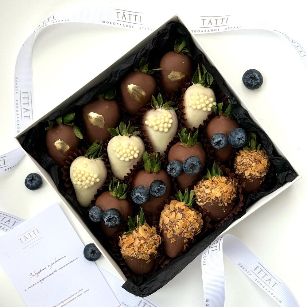 Juicy strawberries in Callebaut Belgian chocolate. Milk and white chocolate. Decoration: waffle crumbs, golden kandurin, blueberries, rice balls in chocolate.