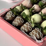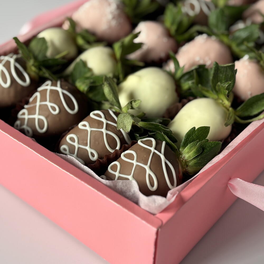 Ingredients: fresh imported strawberries, Belgian white and milk chocolate, cocoa mass, cocoa butter, milk powder, sugar sprinkles.