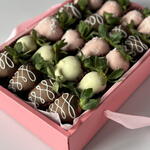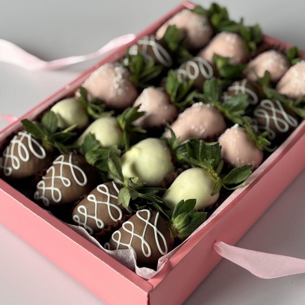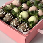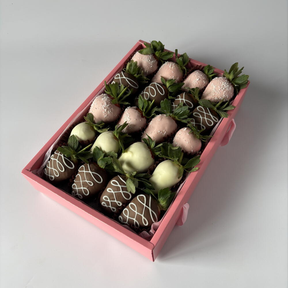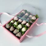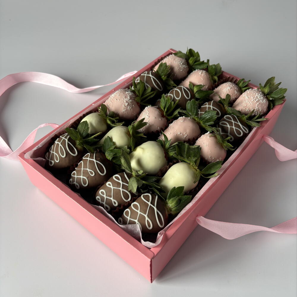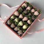 A set of chocolate-covered strawberries can be taken with you when visiting someone or given as a gift to a girlfriend/mom/wife. Only high-quality chocolate is used. Keep refrigerated for no more than 24 hours. Quantity: 20 pieces.
