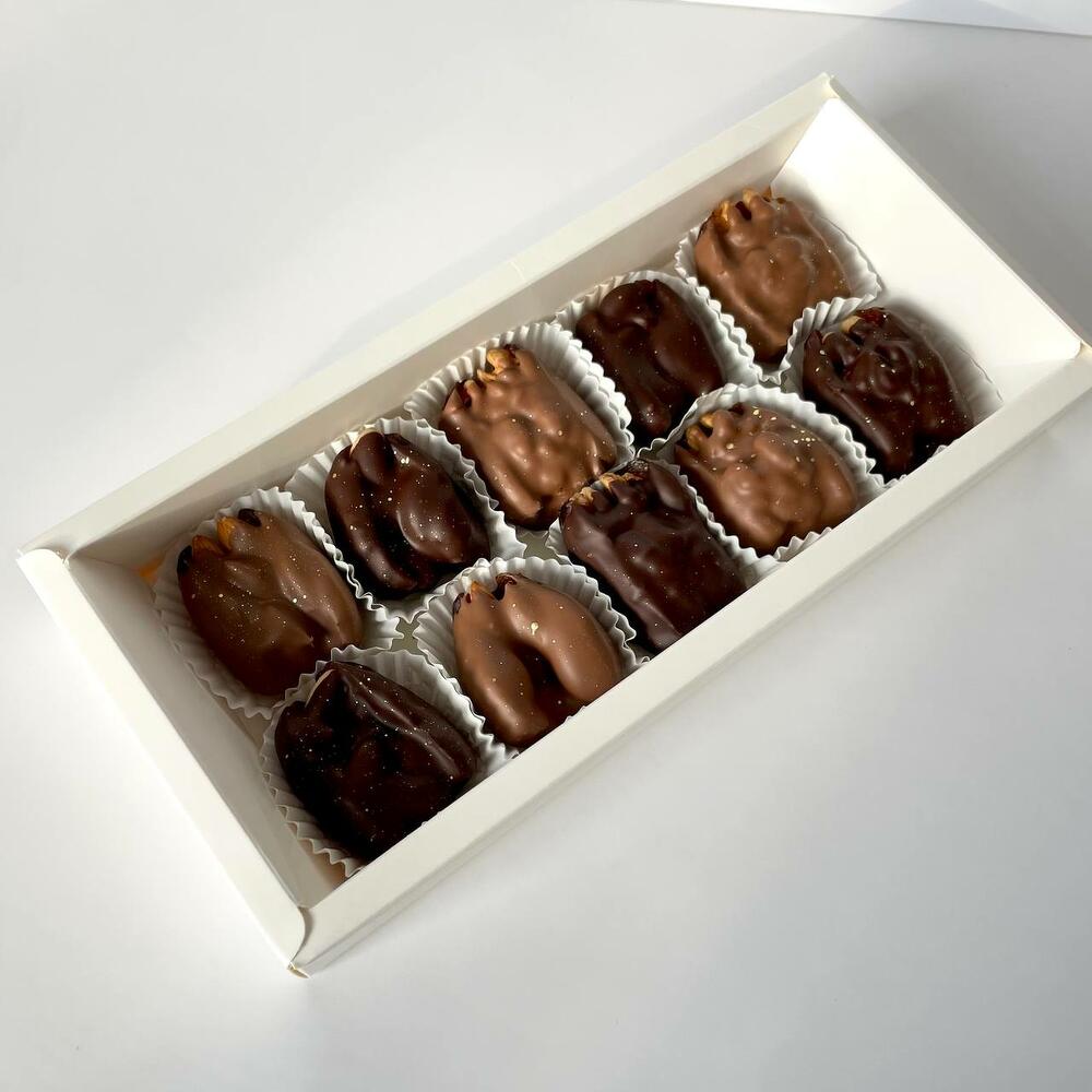 Изысканный набор из 10 штук королевских фиников в шоколаде. Внутри финика жареные орехи кешью, грецкий и миндаль. Срок годности 21 день, при условии хранения в холодильнике. Перед употреблением рекомендуем заранее достать десерт из холодильника, и дать ему согреться в течение 15-20 минут при комнатной температуре, так шоколад станет нежнее и приятнее.