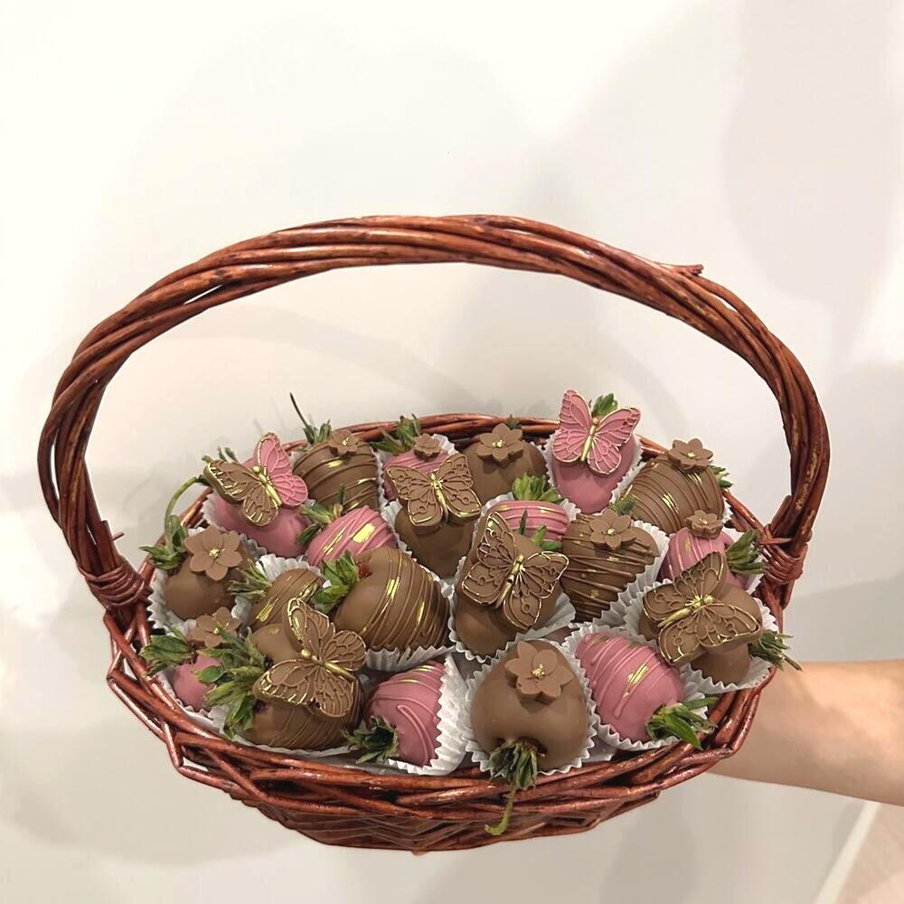 Волшебная корзина, наполненная ароматом свежей клубники и роскошью шоколада! Каждая ягода покрыта нежным молочным или рубиновым шоколадом и украшена изящными золотыми бабочками и цветами, создающими ощущение праздника и утончённости. Этот подарок очарует любого — он сочетает в себе элегантность, романтику и превосходный вкус. Идеально подойдёт для особого повода: дня рождения, годовщины, 8 марта или романтического сюрприза. Вкус свежей клубники и шелковистого шоколада оставит сладкое послевкусие счастья. Храните корзину в холодильнике при температуре от +2 до +6°C, вдали от источников тепла и влаги. Перед подачей дайте десерту постоять 10 минут при комнатной температуре, чтобы шоколад стал мягче и вкус раскрылся полностью.