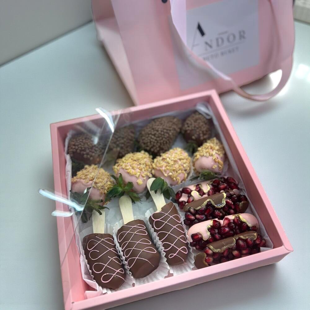 Нежный и элегантный набор “Микс в шоколаде Mini” — это сочетание свежей ароматной клубники и трёх видов изысканного шоколада: тёмного, молочного и белого. Каждый фрукт покрыт тонким слоем шоколада и украшен орехами, ягодами и кондитерским декором. Этот десерт станет идеальным подарком для любимого человека, дополнением к романтическому вечеру или сладким комплиментом по особому случаю. Каждая ягодка — это маленькое произведение искусства, созданное с любовью и вниманием к деталям.