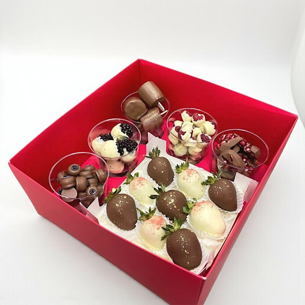 Роскошная подарочная коробка в ярко-красном оформлении — настоящий праздник для сладкоежек! В ней собрано всё, что нужно для идеального настроения: свежие ягоды в белом и молочном шоколаде, мини-десерты в стаканчиках с ежевикой, малиной, гранатом и голубикой. Каждая порция — это гармония свежести, хруста и нежности шоколада. Золотой блеск на ягодах придаёт набору утончённость и делает его отличным выбором для подарка. Такой бокс подойдёт для романтического вечера, дня рождения или просто чтобы порадовать близких. Храните десерт в холодильнике при температуре от +2 до +6°C, избегая прямых солнечных лучей. Перед подачей дайте ему постоять 10–15 минут при комнатной температуре, чтобы шоколад стал мягким и вкус полностью раскрылся.