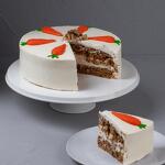 Ingredients: wheat flour, sugar, carrot, vegetable oil, walnut, eggs, orange zest, cinnamon, baking powder, nutmeg, cream cheese, cream, sugar, coloring mixture. Storage conditions: store at a temperature not exceeding +6ºC. Shelf life: no more than 48 hours from the date of manufacture. Nutritional value per 100 g of product: proteins – 11 g, fats – 22 g, carbohydrates – 36 g. Energy value 1610 kJ/385 kcal. The date and time of manufacture are indicated on the packaging. Standard - 1kg Sponge cake with added carrot